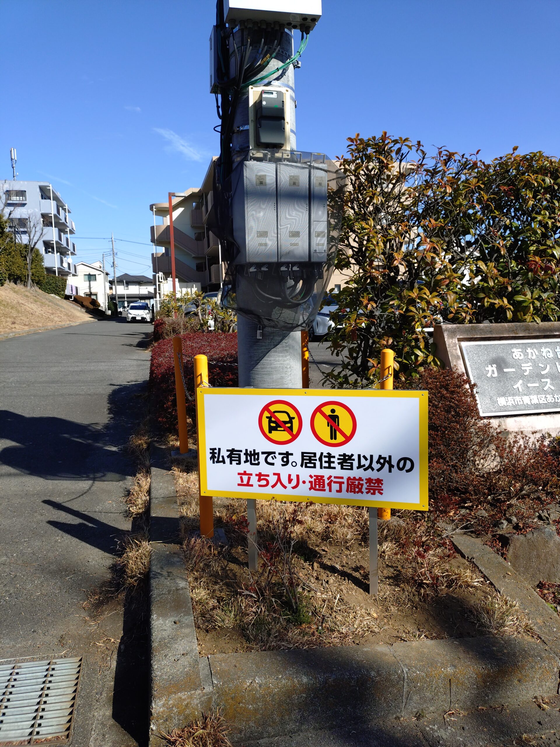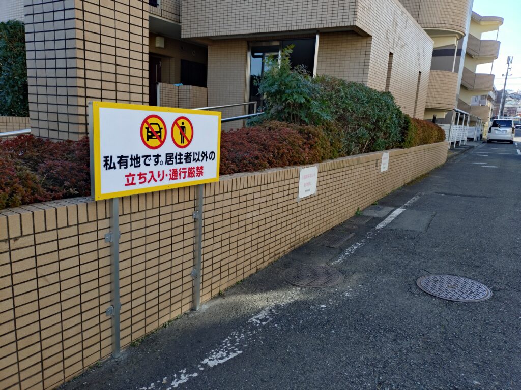 あかね台のマンション入り口に、よその車が入ってこないように促す足つき看板を設置しました。進行方向から見やすいよう、角度に気をつけました。